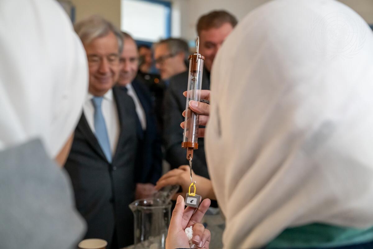 Secretary-General António Guterres (second from left in background) visits a school for girls run by the United Nations Relief and Works Agency for Palestine Refugees in the Near East (UNRWA) in the Wihdat Camp for Palestine refugees in Amman, Jordan.
