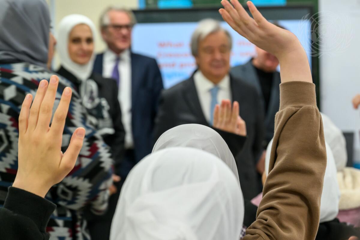 Secretary-General António Guterres (second from right in background) visits a school for girls run by the United Nations Relief and Works Agency for Palestine Refugees in the Near East (UNRWA) in the Wihdat Camp for Palestine refugees in Amman, Jordan.