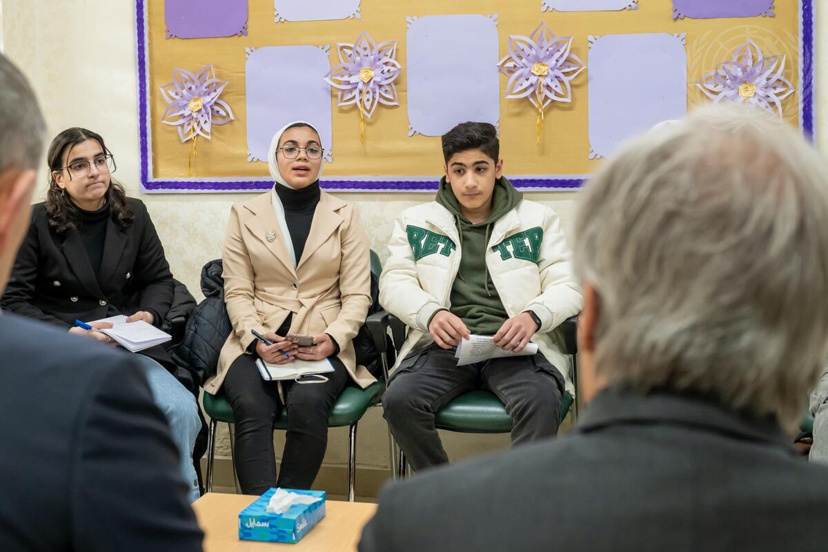 Secretary-General António Guterres (right) meets with student parliamentarian leaders, including 3 students from Gaza, in the Wihdat Camp for Palestine refugees in Amman, Jordan.