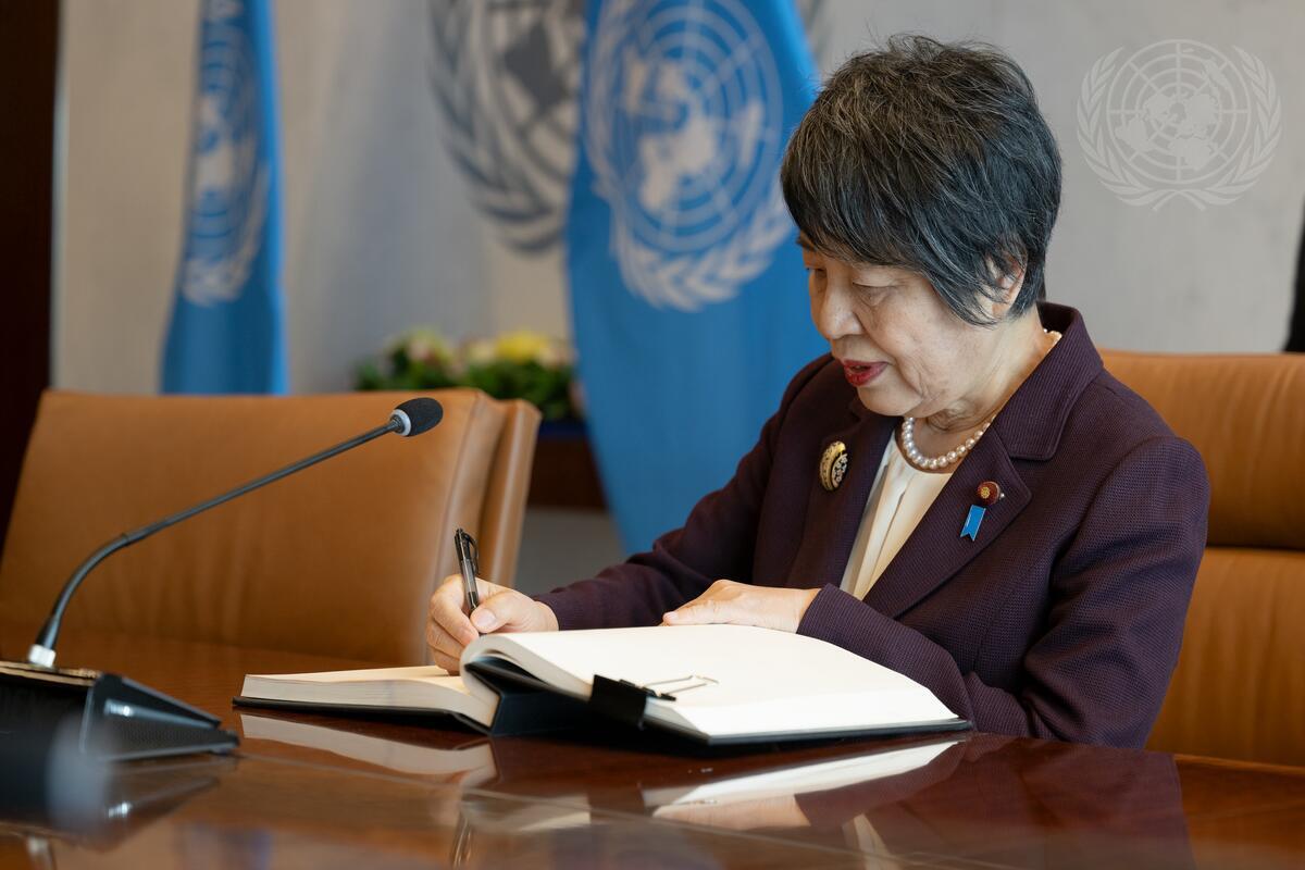 Yoko Kamikawa, Minister for Foreign Affairs of Japan, signs the guest book as she meets with Secretary-General António Guterres (not pictured).