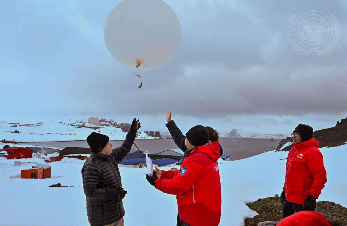 Secretary-General António Guterres (left) and Gabriel Boric Font (behind in the centre), President of the Republic of Chile, release an atmospheric balloon that allows for meteorological measurements from the Base Presidente Eduardo Frei Montalva in Antarctica.