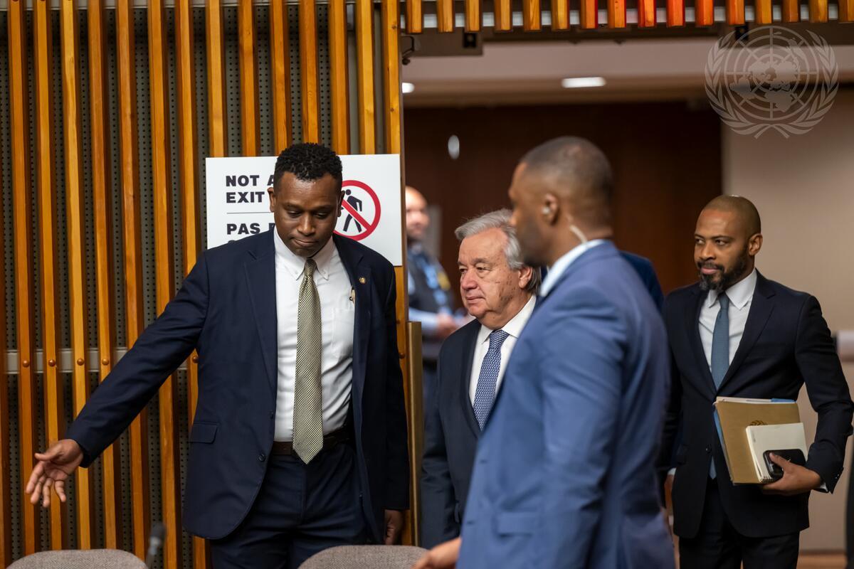 Secretary-General António Guterres (second from left) arrives to the high-level pledging event on the United Nations Central Emergency Response Fund (CERF) for 2024.