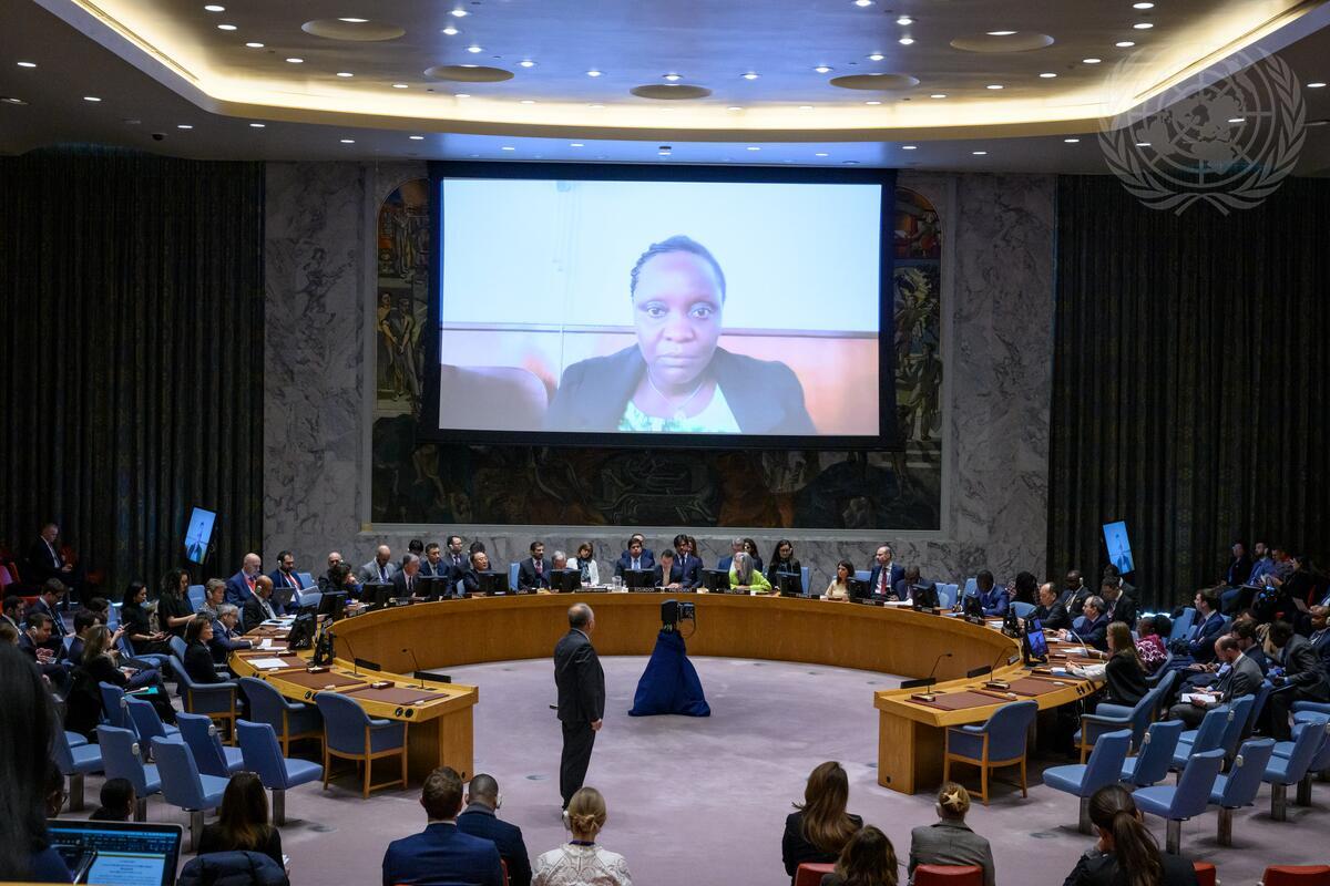 A wide view of the Security Council meeting on threats to international peace and security with focus on transnational organized crime, growing challenges and new threats. On the screen is Victoria Nyanjura, Founder and General Director of Women in Action for Women.