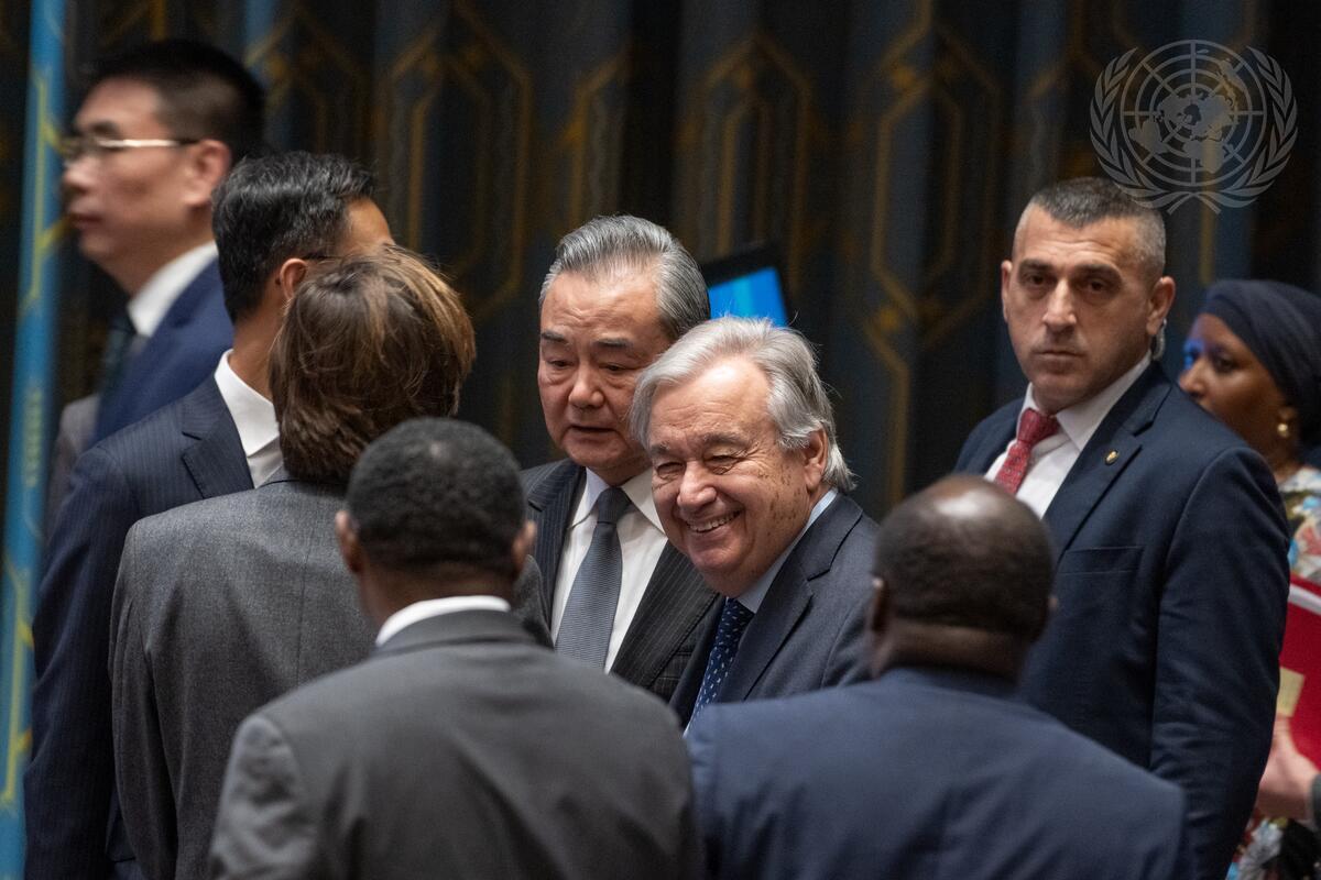 Secretary-General António Guterres (front centre facing the camera) arrives to attend the Security Council meeting on the situation in the Middle East, including the Palestinian question. To his left is Wang Yi, Member of the Political Bureau of the CPC Central Committee and Minister for Foreign Affairs of China.