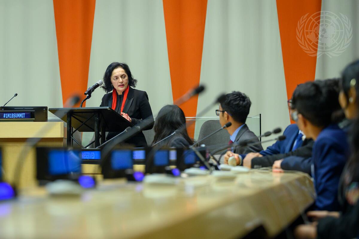 Ruchira Kamboj (at podium), Permanent Representative of India to the United Nations, speaks during the 1M1B Activate Impact Summit.