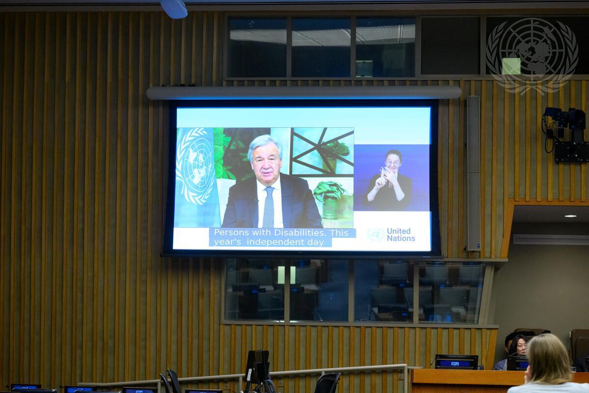 Secretary-General António Guterres (on screen) delivers a message to the commemorative event entitled “United in action to rescue and achieve the Sustainable Development Goals (SDGs) for, with and by persons with disabilities” on the occasion of the International Day of Persons with Disabilities (IDPD) (3 December).