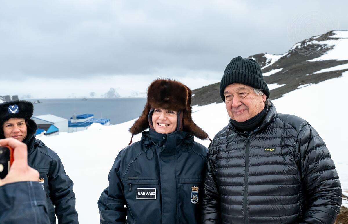 Secretary-General António Guterres (right) and Paula Narváez Ojeda, Permanent Representative of Chile to the United Nations, pose for a photo at the Base Presidente Eduardo Frei Montalva in Antarctica.
