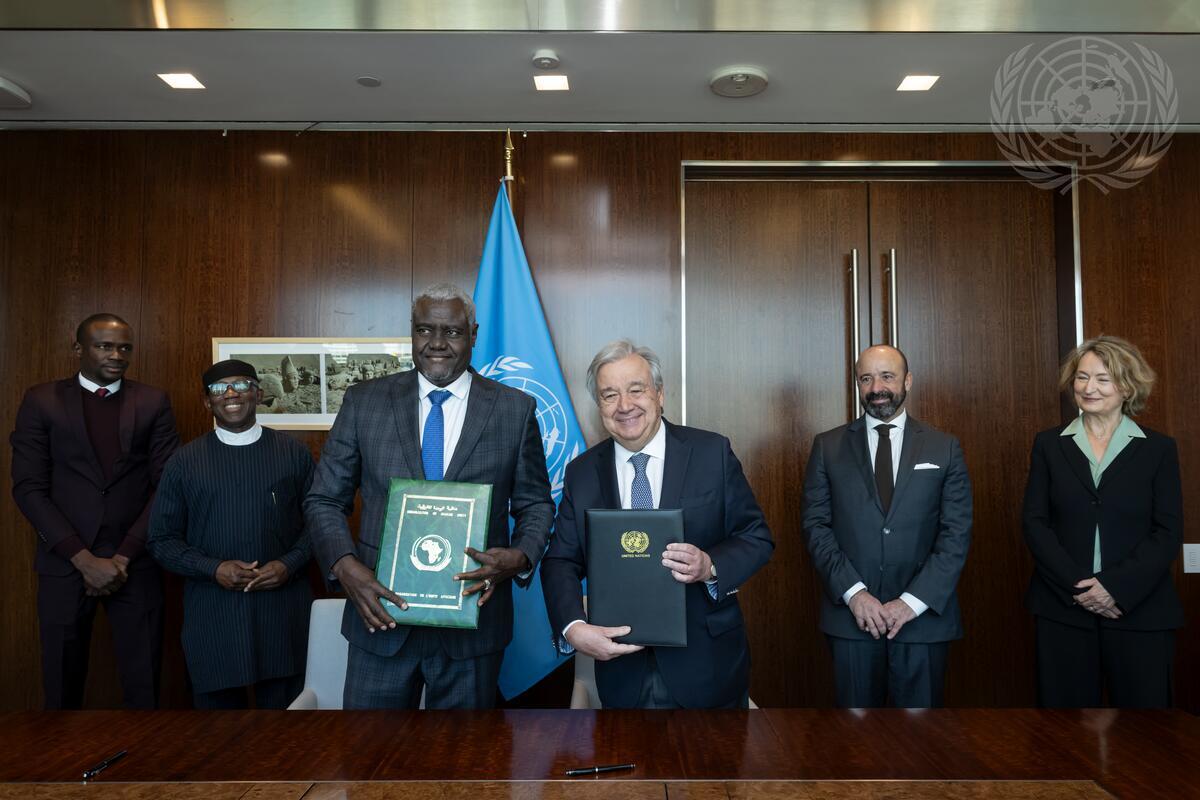 Secretary-General António Guterres (centre right) and Moussa Faki Mahamat (centre left), Chairperson of the African Union Commission, pose for a photo after signing the African Union-United Nations Joint Framework on Human Rights.