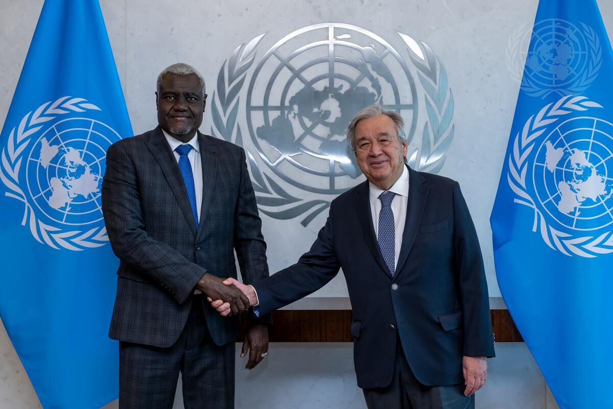 Secretary-General António Guterres (right) meets with Moussa Faki Mahamat, Chairperson of the African Union Commission.