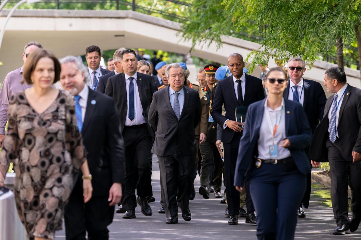 Secretary-General António Guterres (centre of image) walks through the garden to attend the wreath laying ceremony in honour of fallen Peacekeepers at the Peacekeeping Memorial at UN Headquarters.