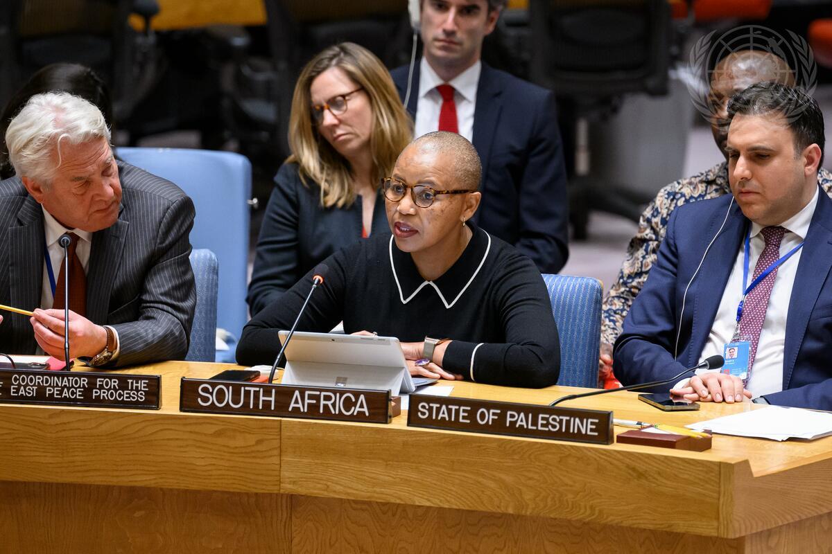 Mathu Joyini (centre), Permanent Representative of the Republic of South Africa to the United Nations, addresses the Security Council meeting on the situation in the Middle East, including the Palestinian question.