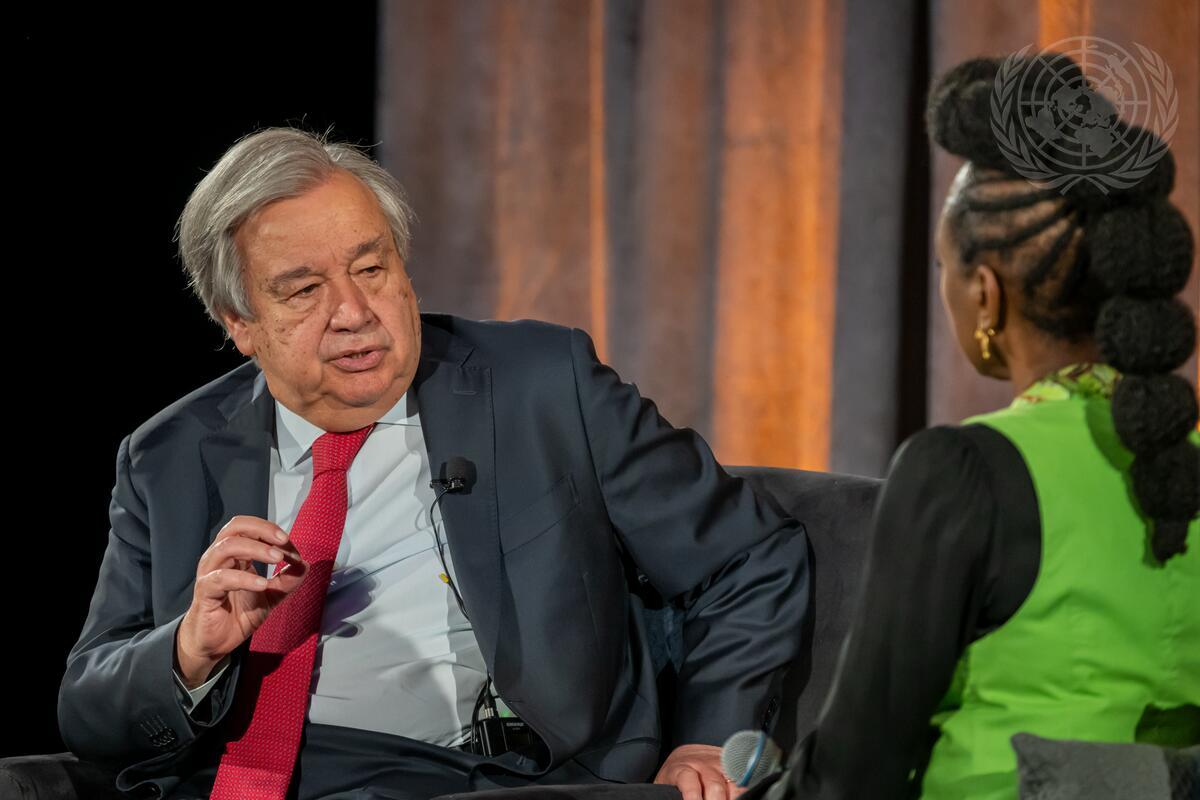 Secretary-General António Guterres (left) speaks with Femi Oke during an event on Climate Action, “A Moment of Truth" at the American Museum of Natural History.