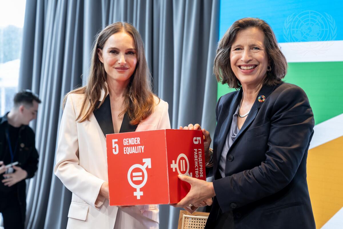 Melissa Fleming (right), Under-Secretary-General for Global Communications, and Natalie Portman, Actress and Activist, pose for a photo after their "fireside chat" on gender equality in the SDG Media Zone.