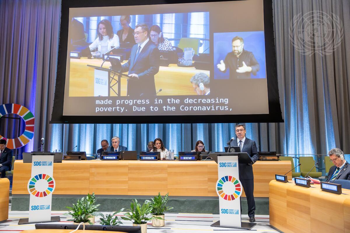 A wide view of the first leaders’ dialogue on “Scaling up actions on key transitions to accelerate SDG progress” held during the 2023 SDG Summit. At the podium at right is Sadyr Zhaparov, President of the Kyrgyz Republic.