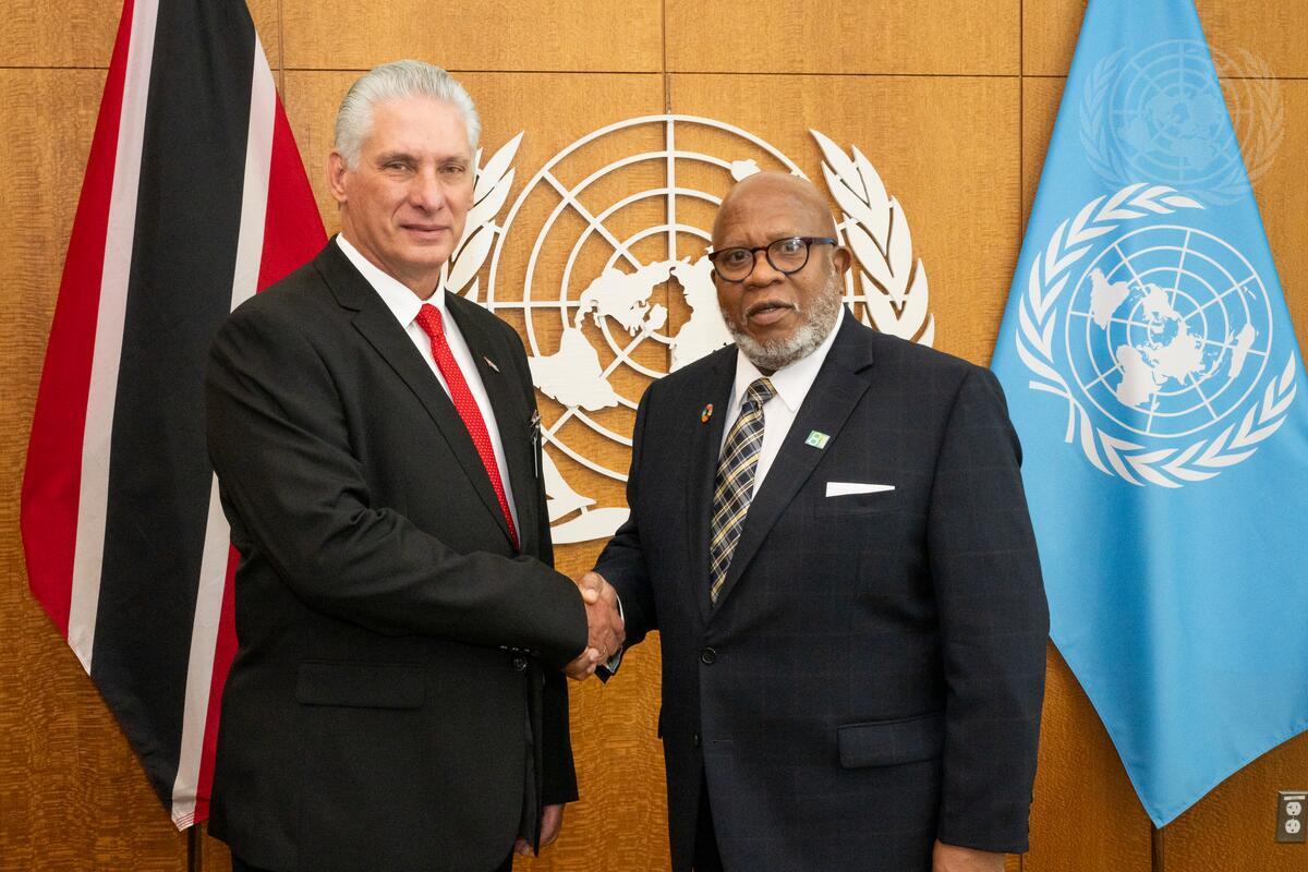 Dennis Francis (right), President of the seventy-eighth session of the General Assembly, meets with Miguel Díaz-Canel Bermúdez, President of the Republic of Cuba.