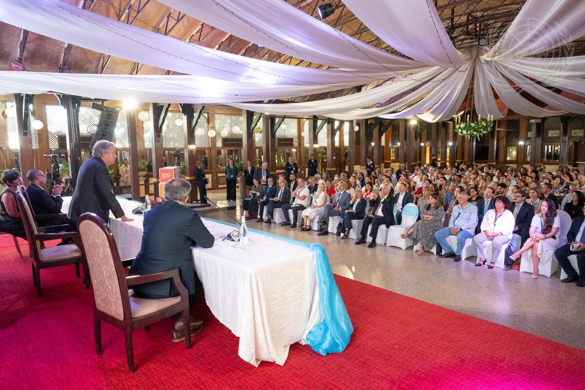 Secretary-General António Guterres (standing at third from left) addresses UN Staff in Havana, Cuba.