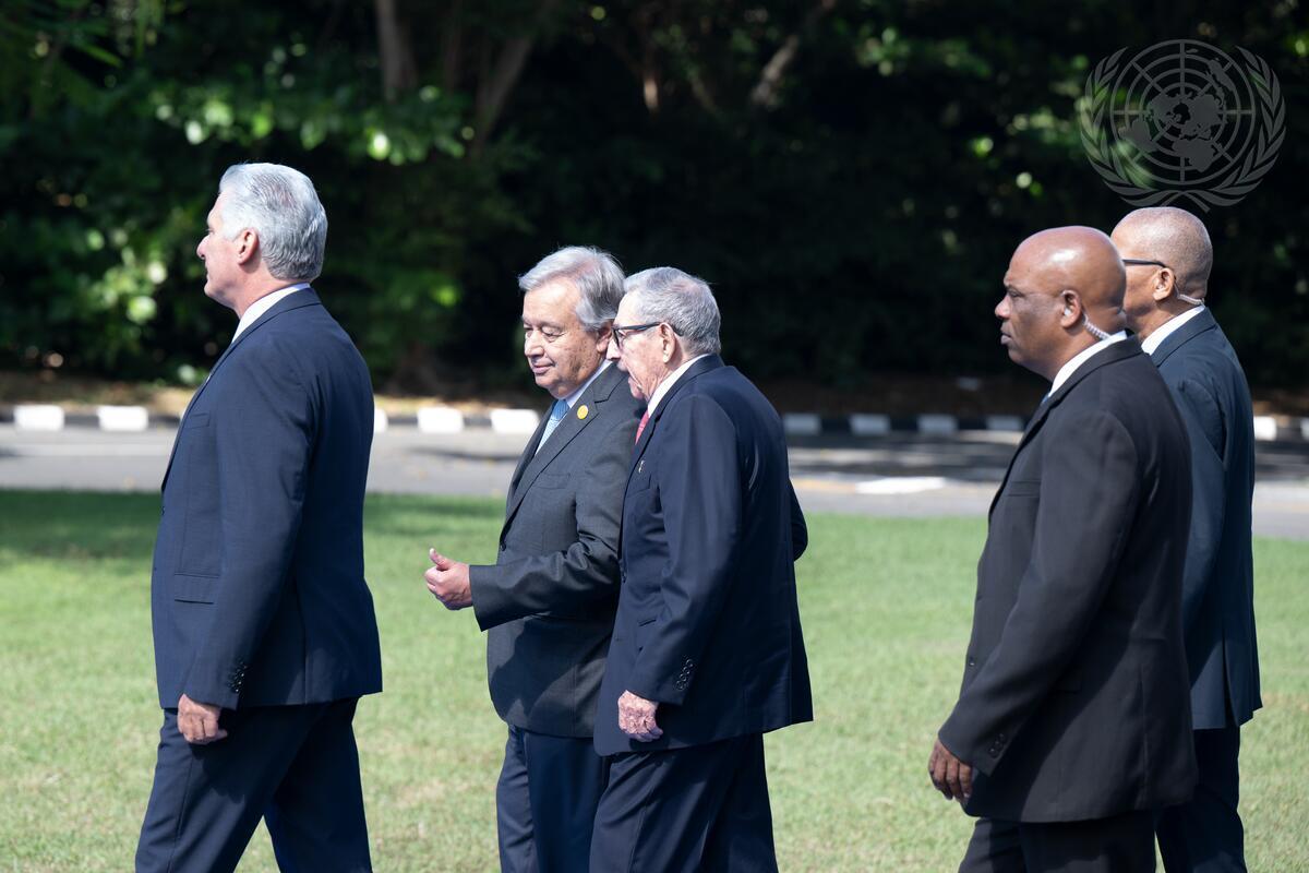 Secretary-General António Guterres (second from left) speaks with Raúl Modesto Castro Ruz, as they walk to take a group photo at the G-77 Summit in Havana, Cuba.