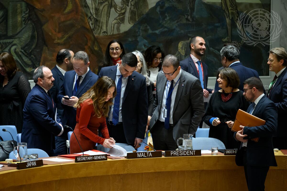 Standing at the table at left is Vanessa Frazier, Permanent Representative of Malta to the United Nations, and to her left is Ian Borg, Minister for Foreign and European Affairs and Trade of Malta. Standing at the table at second from right is Rosemary DiCarlo, Under-Secretary-General for Political and Peacebuilding Affairs.