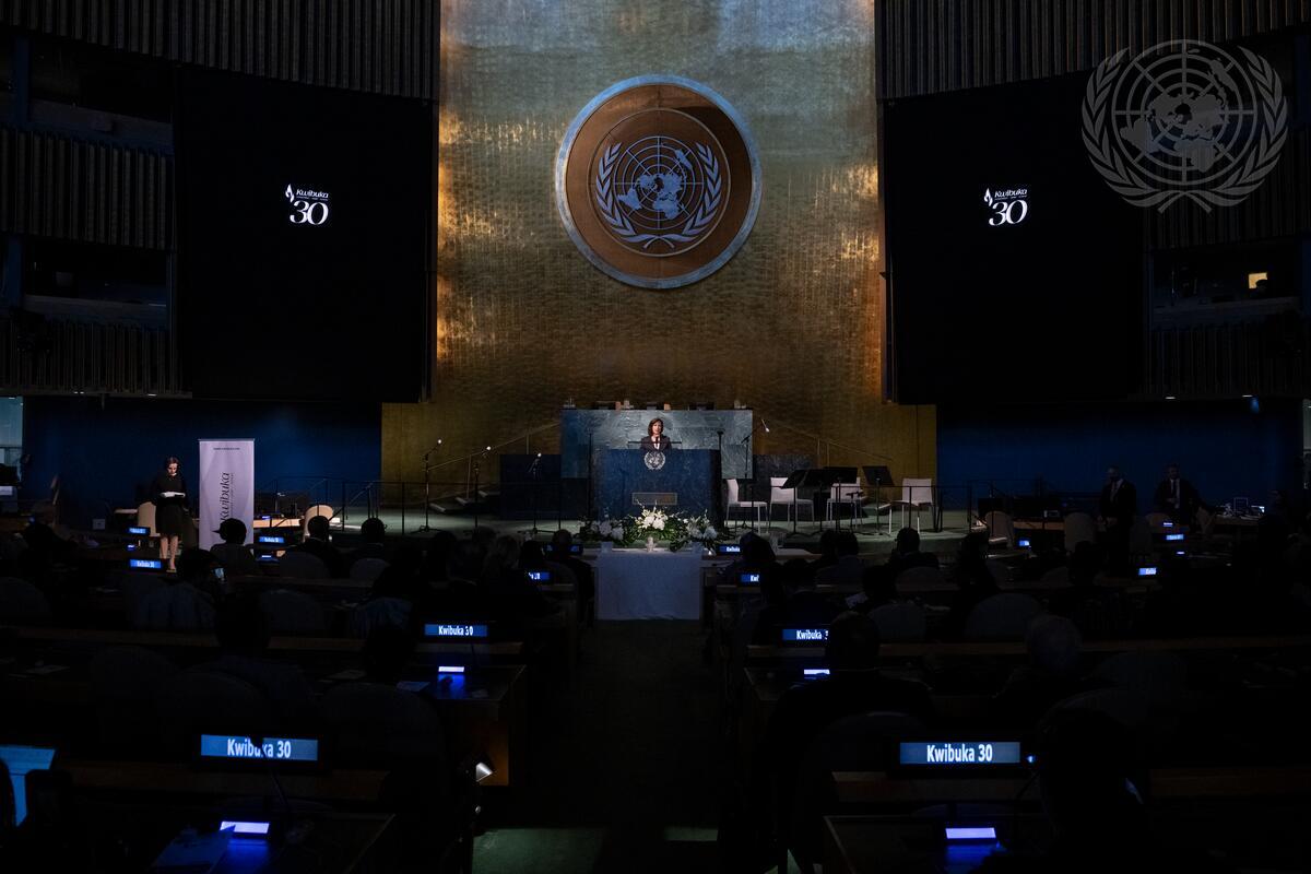 A wide view of the General Assembly Hall as Melissa Fleming (at podium), Under-Secretary-General for Global Communications, hosts the commemoration of thirty years since the 1994 Genocide against the Tutsi in Rwanda on the occasion of the International Day of Reflection on the Genocide against the Tutsi in Rwanda (7 April).