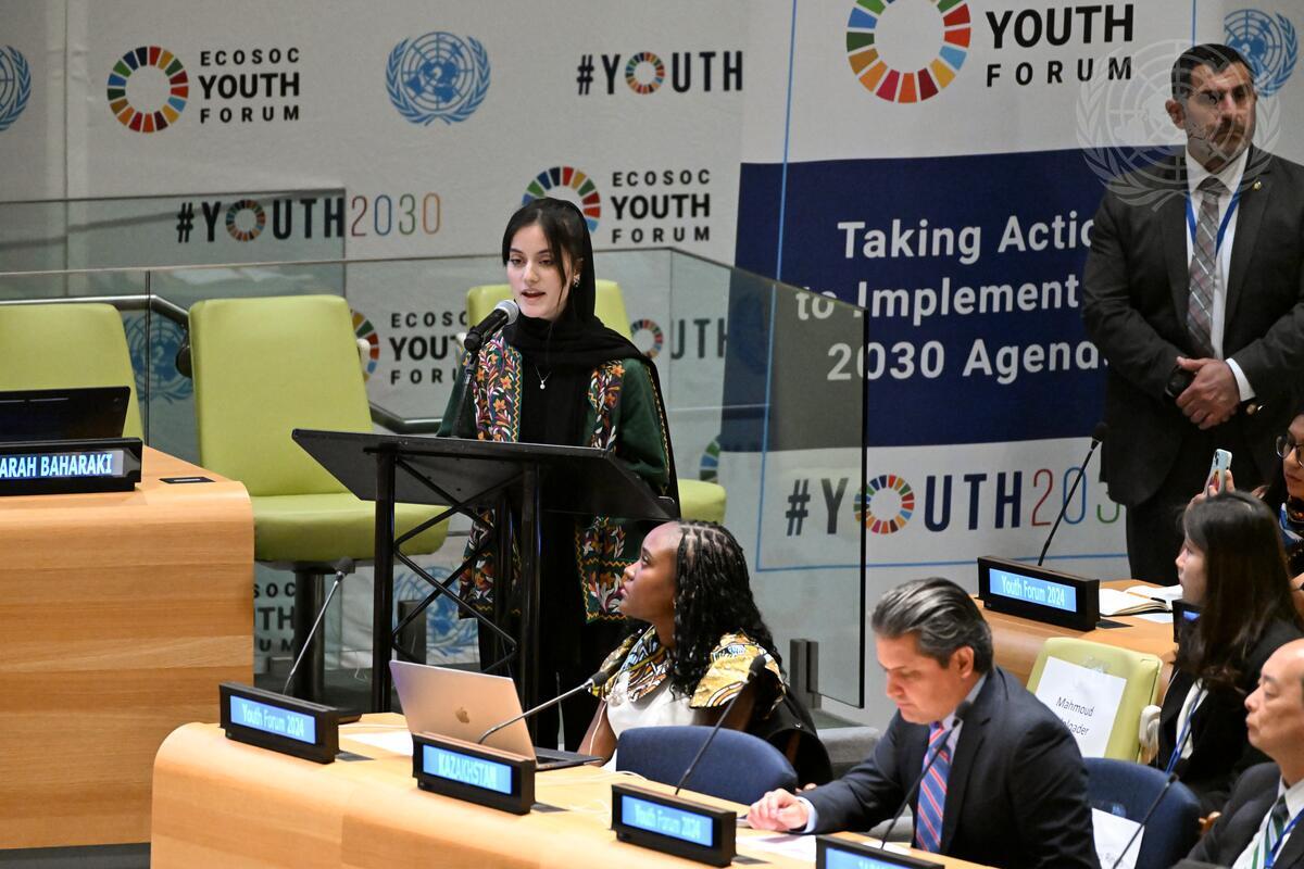 Sarah Baharaki (at podium), Global Youth Ambassador, Theirworld, and Representative of the Major Group on Children and Youth (MGCY), addresses the United Nations Economic and Social Council (ECOSOC) Youth Forum 2024 on the theme: “Youth shaping sustainable and innovative solutions: Reinforcing the 2030 Agenda and eradicating poverty in times of crises”.