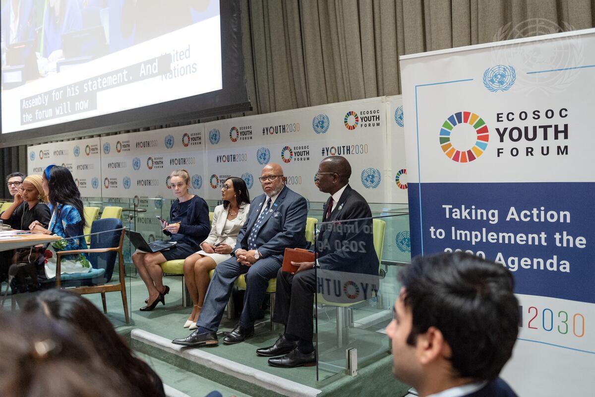Dennis Francis (seated, second from right), President of the seventy-eighth session of the General Assembly, waits to address the United Nations Economic and Social Council (ECOSOC) Youth Forum 2024 on the theme: “Youth shaping sustainable and innovative solutions: Reinforcing the 2030 Agenda and eradicating poverty in times of crises”.