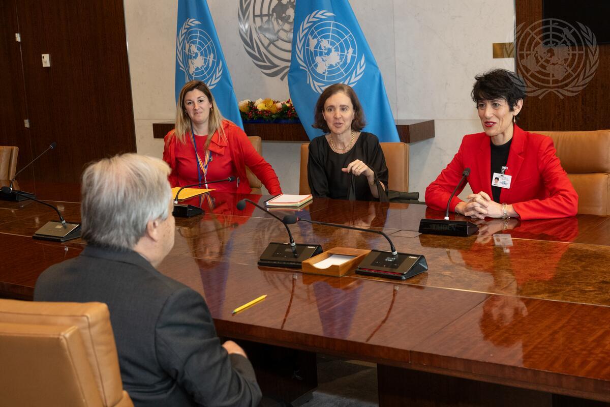Secretary-General António Guterres (left with back to camera) meets with Elma Saiz Delgado (right), Minister for Inclusion, Social Security and Migration of Spain.