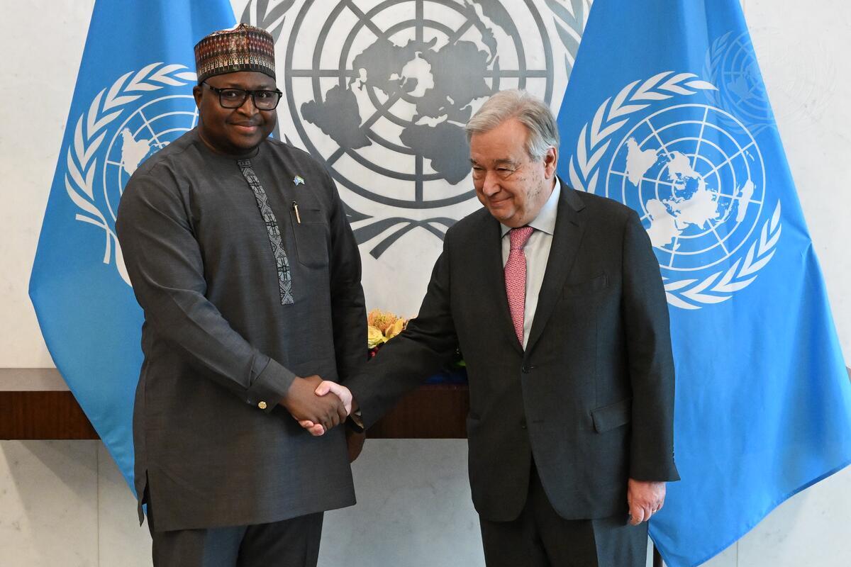 Secretary-General António Guterres (right) meets with Musa Timothy Kabba, Minister for Foreign Affairs and International Cooperation of the Republic of Sierra Leone.