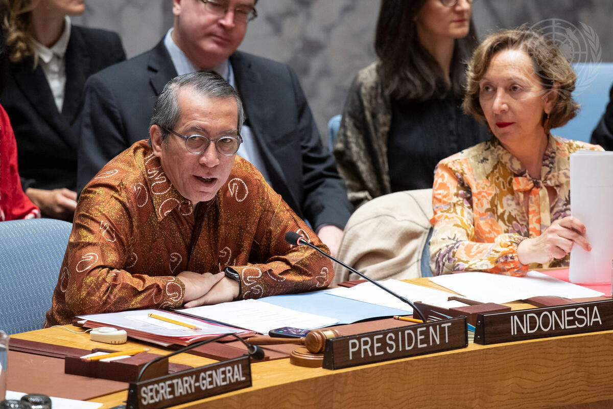 Dian Triansyah Djani, Permanent Representative of Indonesia to the United Nations and President of the Security Council for the month of May, chairs the Security Council meeting on the situation in the Middle East (Syria). At right is Hasmik Egian, Director of the Security Council Affairs Division of the Department of Political and Peacebuilding Affairs (DPPA).