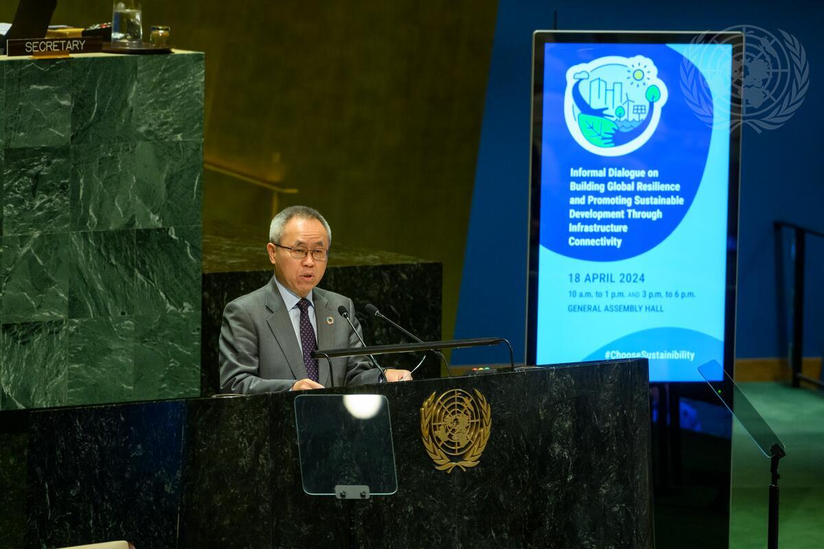Li Junhua, Under Secretary-General of Economic and Social Affairs, addresses the informal dialogue of the General Assembly on building global resilience and promoting sustainable development through infrastructure connectivity.