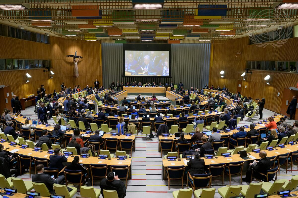 A wide view of the Economic and Social Council Financing for Development Forum on theme "Embarking on the path toward the Fourth International Conference on Financing for Development". On the screen is Secretary-General António Guterres.