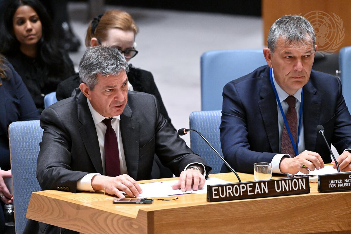 Stavros Lambrinidis, Head of Delegation of the European Union to the United Nations, addresses the Security Council meeting on the situation in the Middle East, including the Palestinian question. At right is Philippe Lazzarini, Commissioner-General of the United Nations Relief and Works Agency for Palestine Refugees in the Near East (UNRWA).