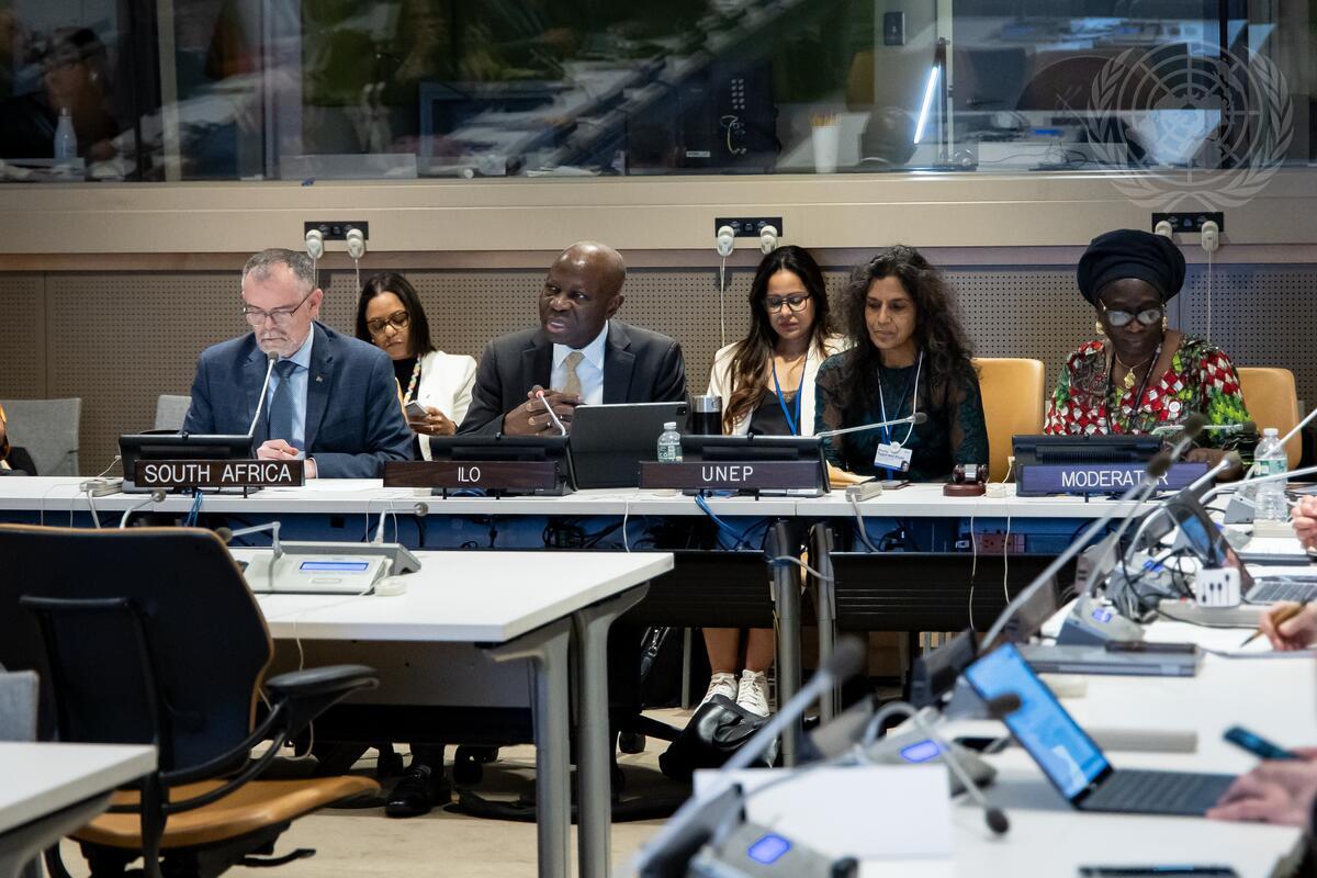 Gilbert F. Houngbo (second from left at table), Director-General of the International Labour Organization (ILO), speaks at the launch of the ILO flagship World Social Protection Report 2024-26: Universal Social Protection for Climate Action and a Just Transition. The high-level event explored the themes and policy recommendations of the World Social Protection Report 2024-26, providing a forum for reflection on key policy messages related to universal social protection and climate action.