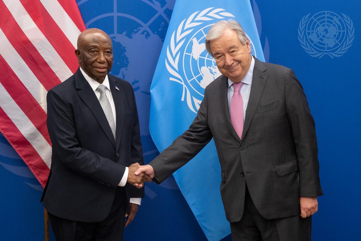 Secretary-General António Guterres (right) meets with Joseph Nyuma Boakai, Sr., President of the Republic of Liberia.