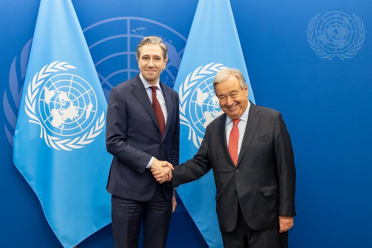 Secretary-General António Guterres (right) meets with Simon Harris, Taoiseach of Ireland.