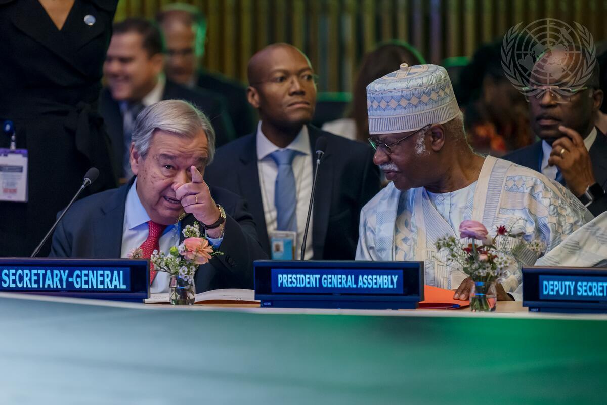 Secretary-General António Guterres (left) and Philemon Yang (right), President of the seventy-ninth session of the United Nations General Assembly, at the SDG Moment 2024 - Driving Just Transitions for SDG Acceleration.