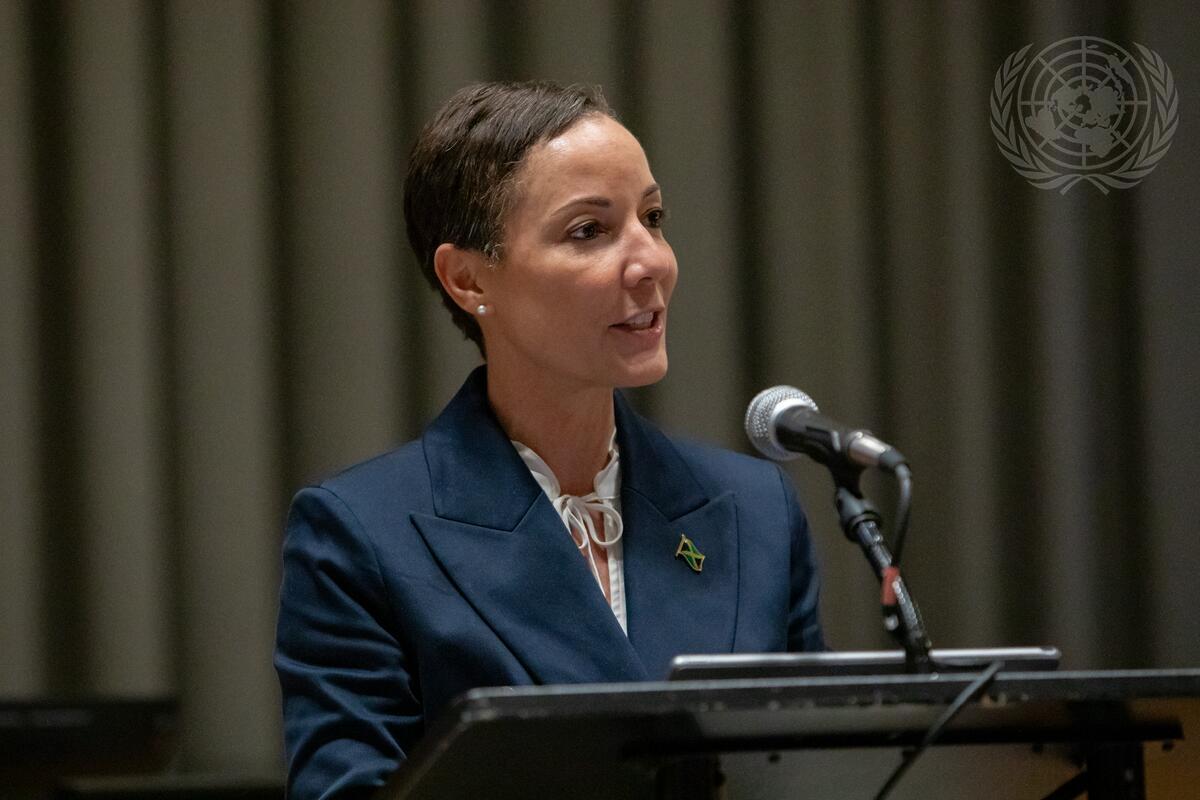 Kamina Johnson Smith, Minister for Foreign Affairs and Foreign Trade of Jamaica, addresses the opening and plenary segment of the High-level plenary meeting of the General Assembly on the theme "Addressing the threats posed by sea level rise". The General Assembly adopted draft resolution A/78/L.35 on holding a High-Level plenary meeting on addressing the existential threats posed by sea-level rise.