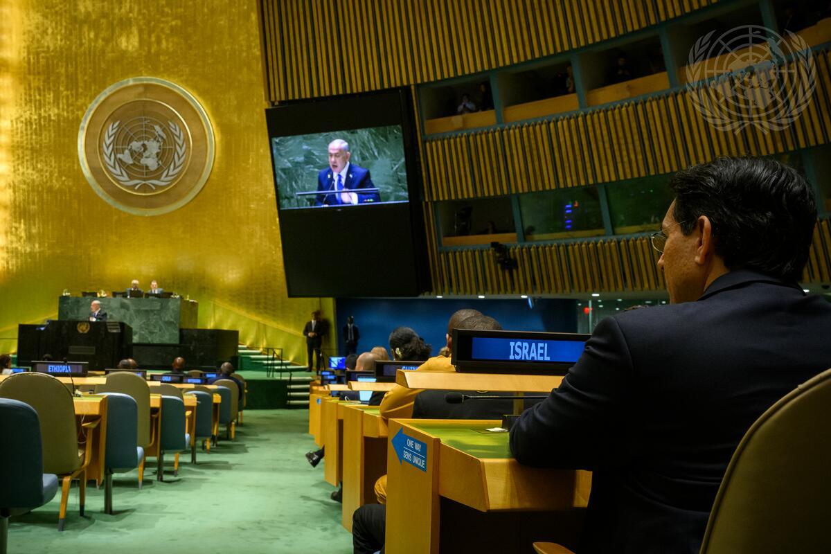 A wide view as Benjamin Netanyahu (at podium and on screen), Prime Minister of the State of Israel, addresses the general debate of the General Assembly’s seventy-ninth session. Seated at right is Danny Danon, Permanent Representative of Israel to the United Nations.