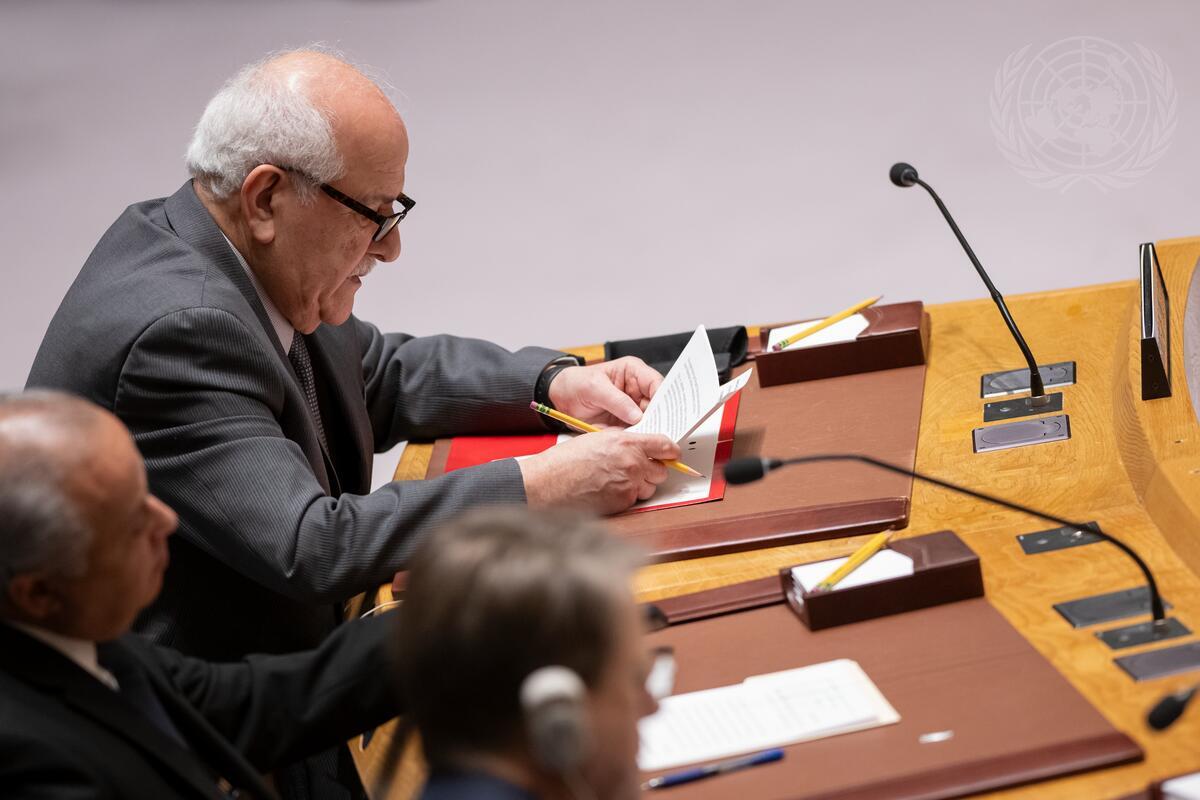 Riyad Mansour, Permanent Observer of the State of Palestine to the United Nations, briefs the Security Council meeting on the situation in the Middle East, including the Palestinian question.