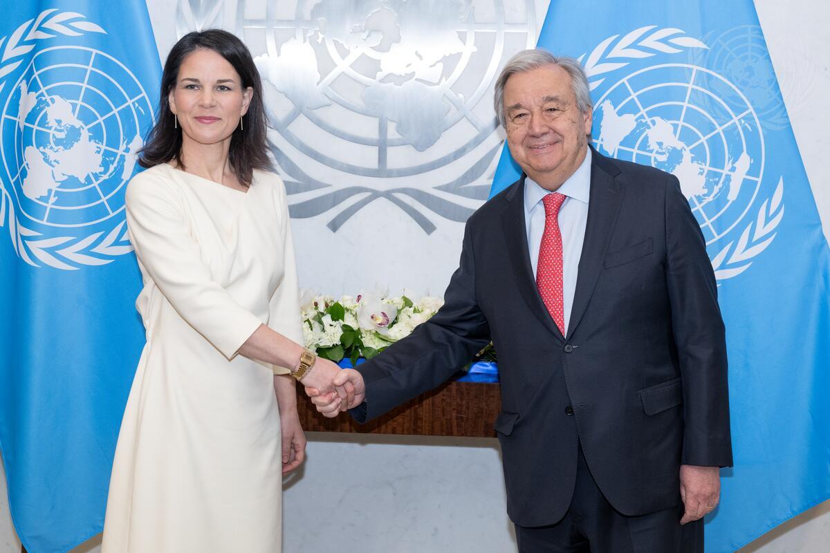 Secretary-General António Guterres (right) meets with Annalena Baerbock, Federal Minister for Foreign Affairs of the Federal Republic of Germany.