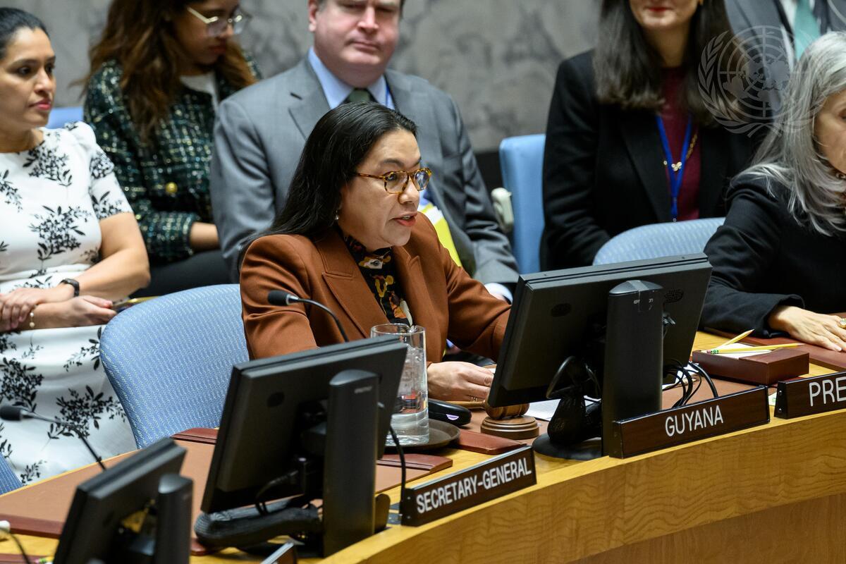 Carolyn Rodrigues-Birkett, Permanent Representative of Guyana to the United Nations and President of the Security Council for the month of February, chairs the Security Council meeting to hear a briefing on the Security Council mission to Colombia (7 to 11 February 2024).