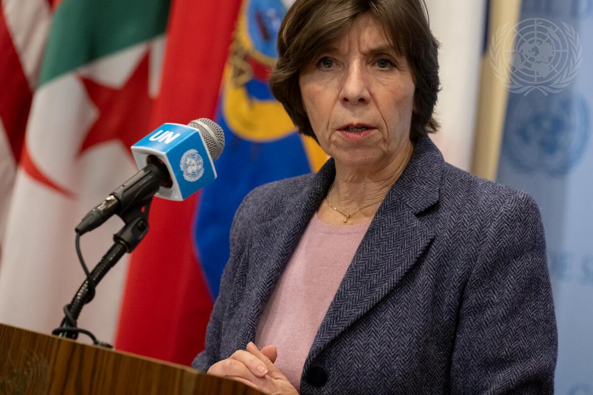 Catherine Colonna, Chair of the Independent Review Group on the United Nations Relief and Works Agency, briefs reporters at UN Headquarters.
