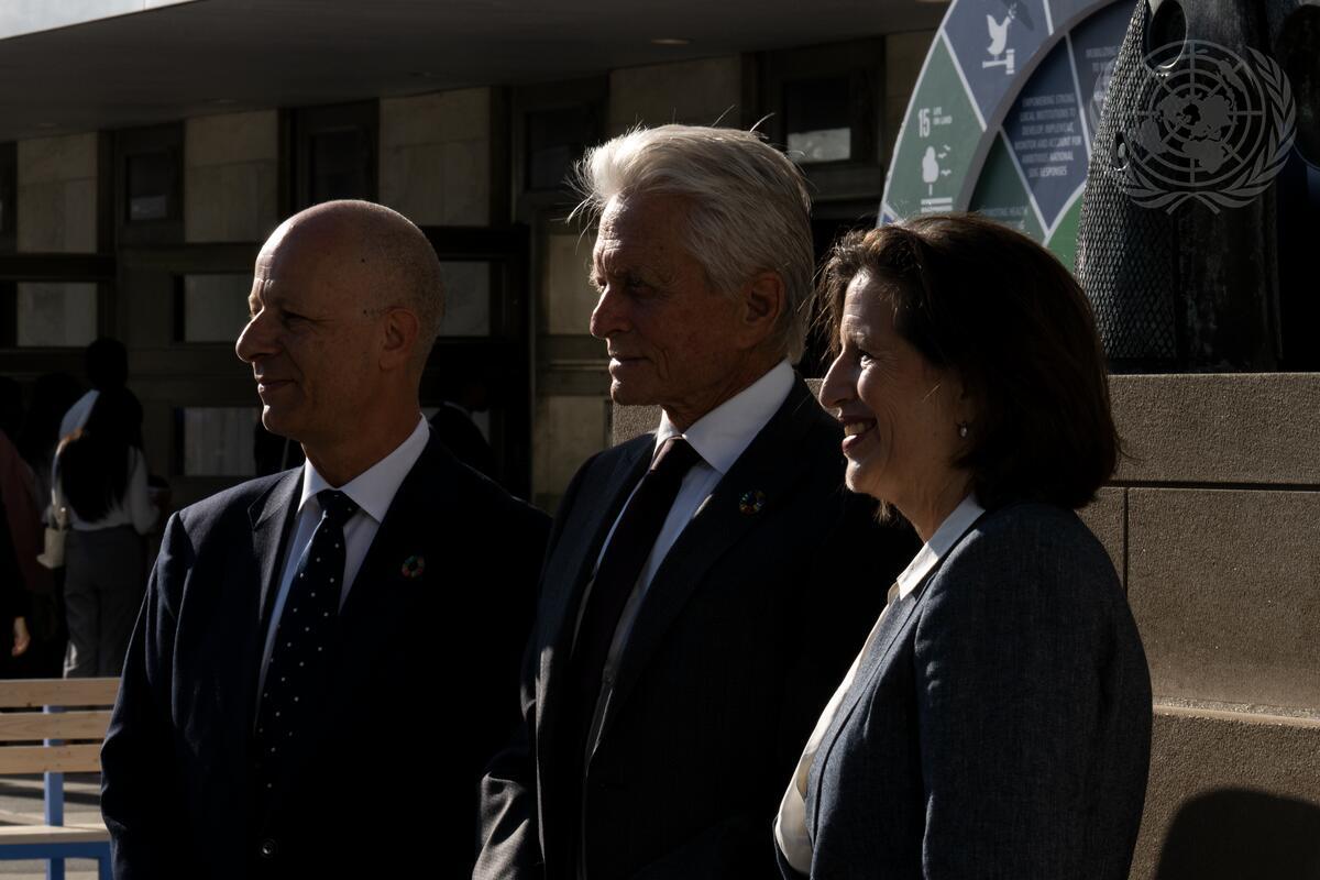 From left to right are: Maher Nasser, Director of the Outreach Division of Department of Global Communications; Michael Douglas, United Nations Messenger of Peace; and Melissa Fleming, Under-Secretary-General for Global Communications.