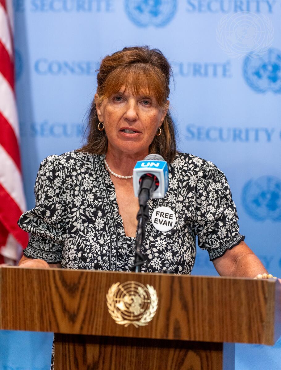 Ella Milman, mother of detained Wall Street Journal reporter Evan Gershkovich, briefs journalists about her son during a press conference organized by Linda Thomas-Greenfield (not pictured), Permanent Representative of the United States to the United Nations, in her national capacity, on wrongful detentions in the Russian Federation.