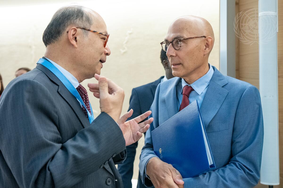 Volker Türk (right), United Nations High Commissioner for Human Rights, speaks with Xu Chen, Permanent Representative of China to the United Nations Office at Geneva, during the opening of the fifty-fourth session of the Human Rights Council.
