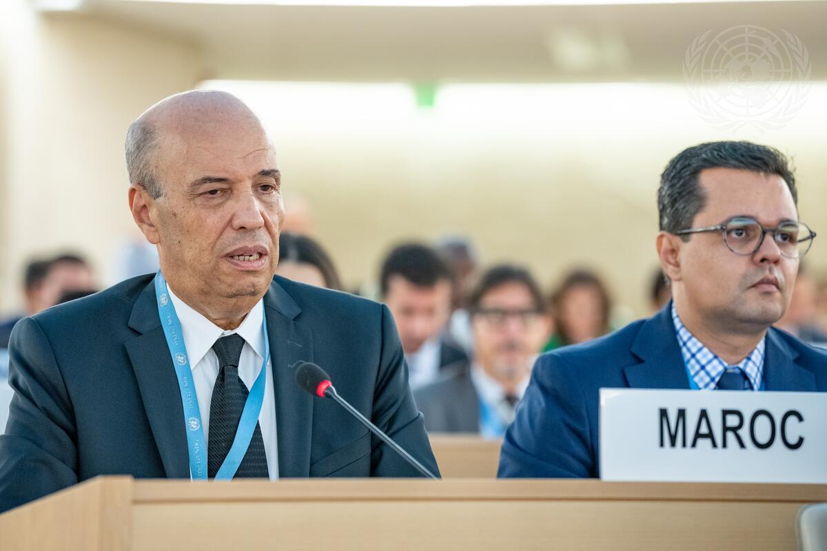 Omar Zniber (left), Permanent Representative of Morocco to the United Nations Office at Geneva, speaks during the opening of the fifty-fourth session of the Human Rights Council.