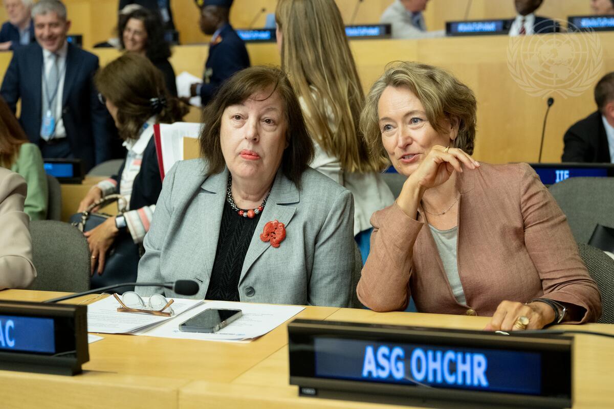Ilze Brands Kehris (right), Assistant Secretary-General for Human Rights in the Office of the High Commissioner for Human Rights (OHCHR), speaks with Virginia Gamba de Potgieter, Special Representative of the Secretary-General for Children and Armed Conflict, during the commemorative event on the 4th observance of the International Day to Protect Education from Attack.