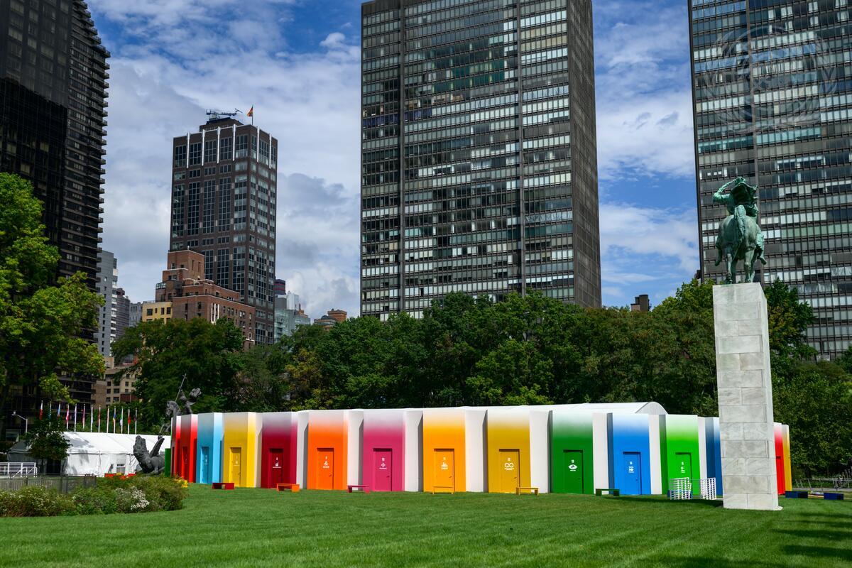 A view of the SDG Pavilion, a convening space and art installation on the United Nations North Lawn supported by Project Everyone. The space will hold a full week of talks and performances during the seventy-eighth session of the General Assembly debate, in support of the Sustainable Development Goals (SDG) Halftime Campaign to accelerate action for people and planet.
