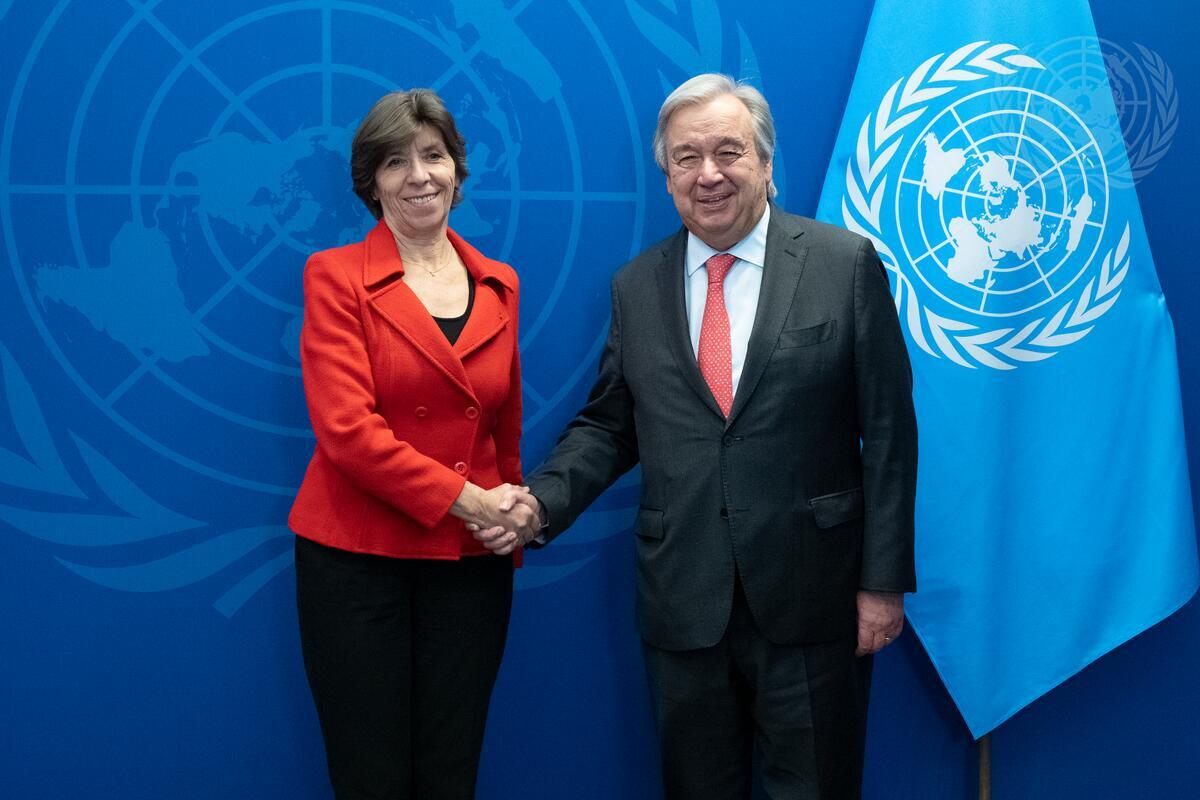 Secretary-General António Guterres (right) meets with Catherine Colonna, Minister for Europe and Foreign Affairs of France.