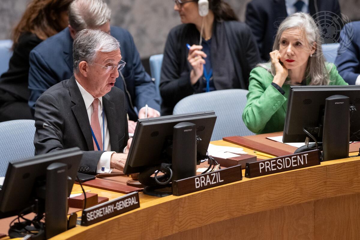 Sérgio França Danese (left), Permanent Representative of Brazil to the United Nations and President of the Security Council for the month of October, chairs the Security Council meeting on the situation in the Middle East, including the Palestinian question.