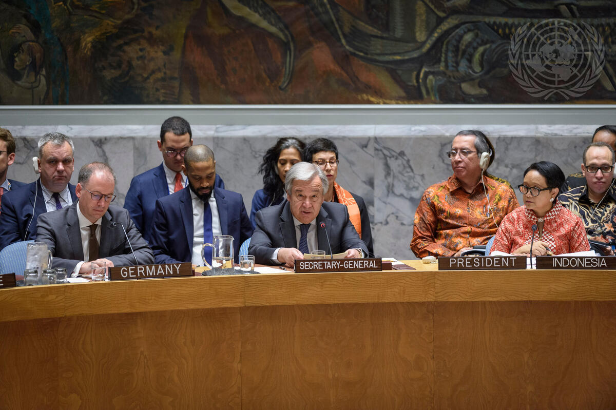 Secretary-General António Guterres (centre) briefs the Security Council on protection of civilians in armed conflict. At right is Retno Lestari Priansari Marsudi, Minister for Foreign Affairs of the Republic of Indonesia and President of the Security Council for the month of May, and at left is Niels Annen, Minister of State at the Federal Foreign Office of Germany.